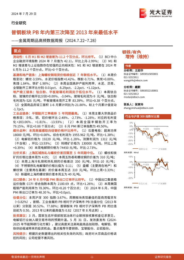 【光大证券】【20240729】20240729-光大证券-钢铁 有色行业金属周期品高频数据周报:普钢板块PB年内第三次降至2013年来最低水平-27页