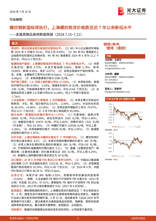【光大证券】【20240722】20240722-光大证券-金属周期品高频数据周报:螺纹钢新国标将执行,上海螺纹现货价格跌至近7年以来新低水平-27页
