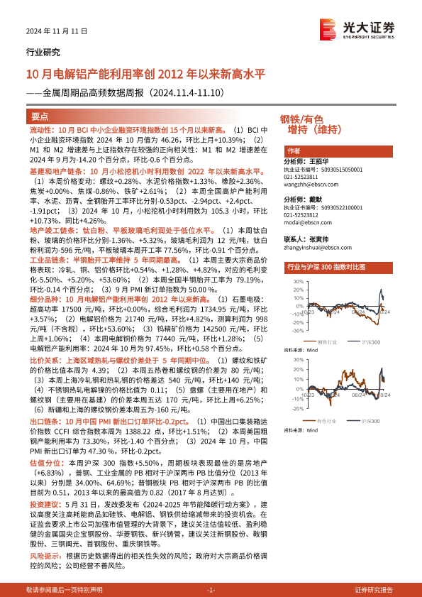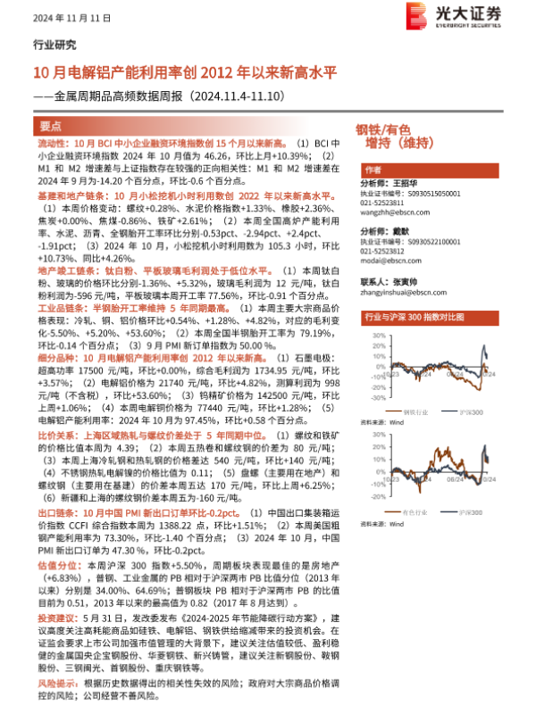 【光大证券】【20241111】20241111-光大证券-钢铁 有色行业金属周期品高频数据周报:10月电解铝产能利用率创2012年以来新高水平-27页
