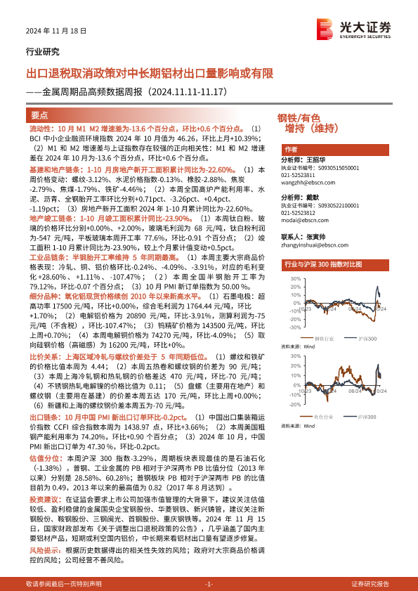 【光大证券】【20241118】金属周期品高频数据周报:出口退税取消政策对中长期铝材出口量影响或有限-27页