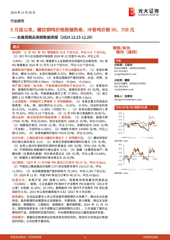 【光大证券】【20241230】20241230-光大证券-钢铁 有色行业金属周期品高频数据周报:9月底以来,螺纹钢吨价格跑输热卷、冷卷吨价格90、708元-27页