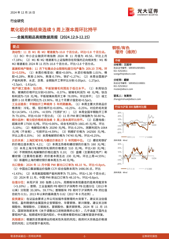 【光大证券】【20241216】20241216-光大证券-钢铁 有色行业金属周期品高频数据周报:氧化铝价格结束连续9周上涨本周环比持平-27页