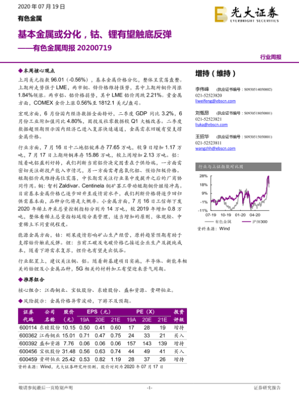 【光大证券】【20200719】20200719-光大证券-有色金属周报:基本金属或分化,钴、锂有望触底反弹-12页