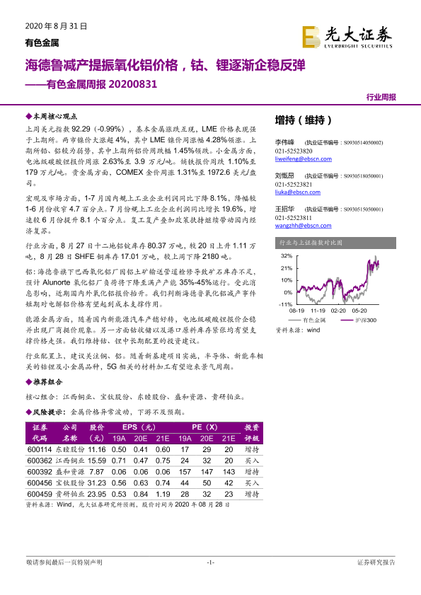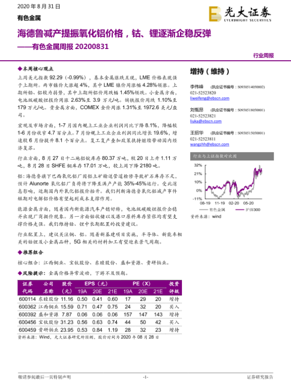 【光大证券】【20200831】20200831-光大证券-有色金属周报:海德鲁减产提振氧化铝价格,钴、锂逐渐企稳反弹-11页