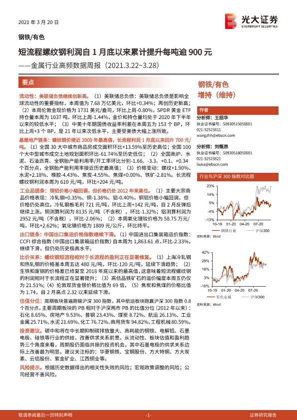 【光大证券】【20210320】20210320-光大证券-金属行业高频数据周报:短流程螺纹钢利润自1月底以来累计提升每吨逾900元-15页