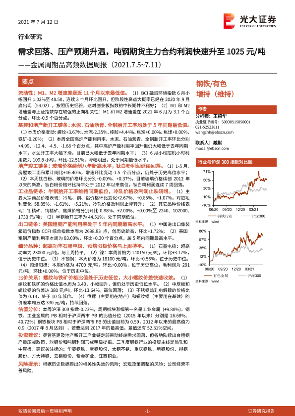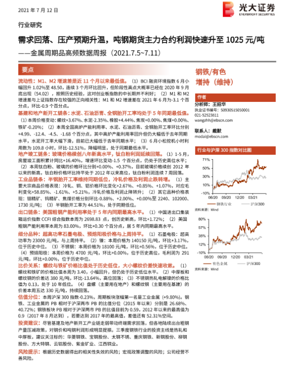 【光大证券】【20210712】金属周期品高频数据周报:需求回落、压产预期升温,吨钢期货主力合约利润快速升至1025元/吨-24页