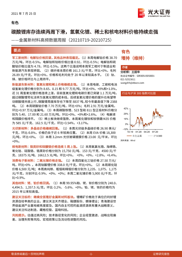 【光大证券】【20210725】金属新材料高频数据周报:碳酸锂库存连续两周下滑,氢氧化锂、稀土和核电材料价格持续走强-26页