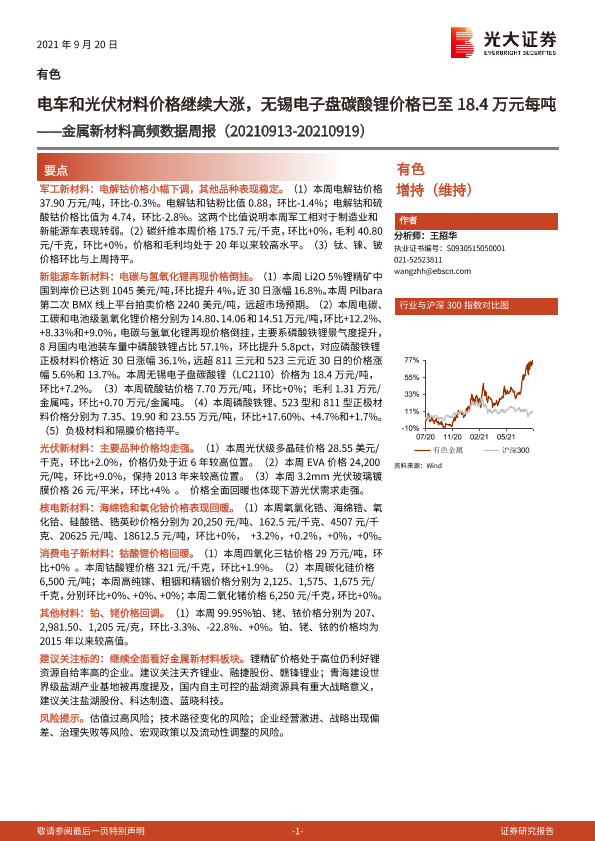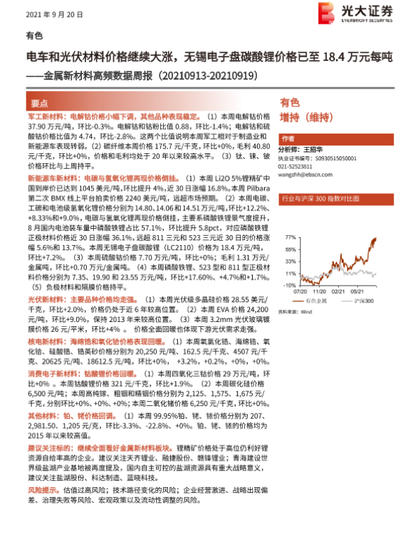 【光大证券】【20210920】20210920-光大证券-金属新材料高频数据周报:电车和光伏材料价格继续大涨,无锡电子盘碳酸锂价格已至18.4万元每吨-27页