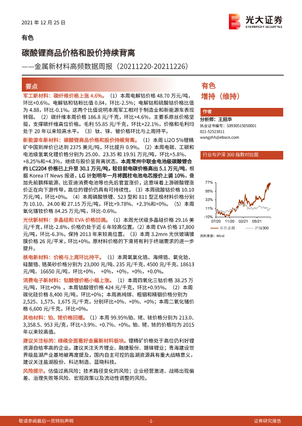 【光大证券】【20211225】金属新材料高频数据周报:碳酸锂商品价格和股价持续背离-27页