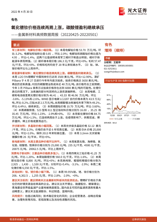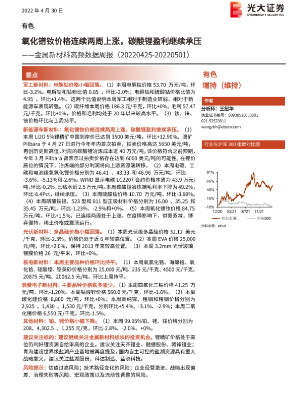 【光大证券】【20220430】金属新材料高频数据周报:氧化镨钕价格连续两周上涨,碳酸锂盈利继续承压-26页