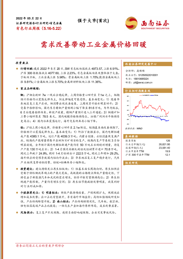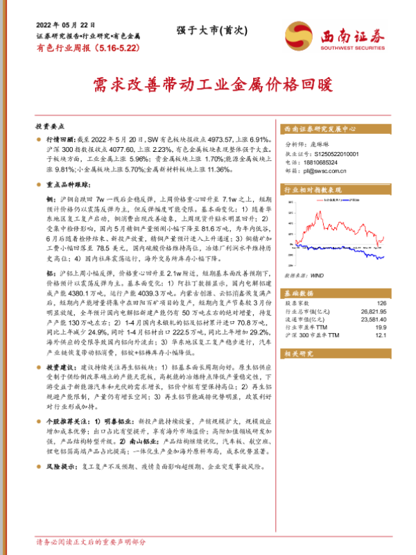 【西南证券】【20220522】20220522-西南证券-有色行业周报:需求改善带动工业金属价格回暖-11页
