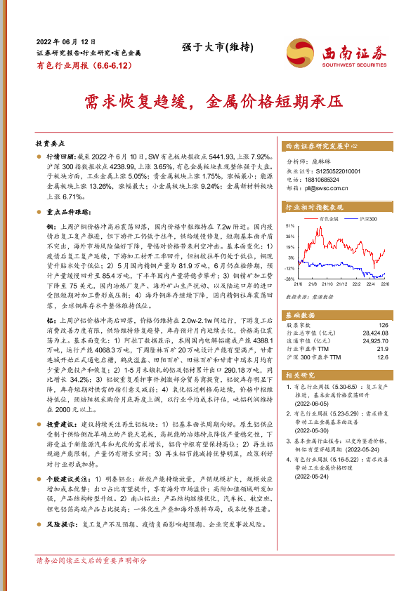 【西南证券】【20220612】20220612-西南证券-有色行业周报:需求恢复趋缓,金属价格短期承压-11页
