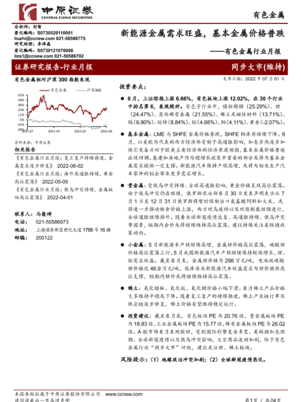 【中原证券】【20220701】20220701-中原证券-有色金属行业月报:新能源金属需求旺盛,基本金属价格普跌-24页