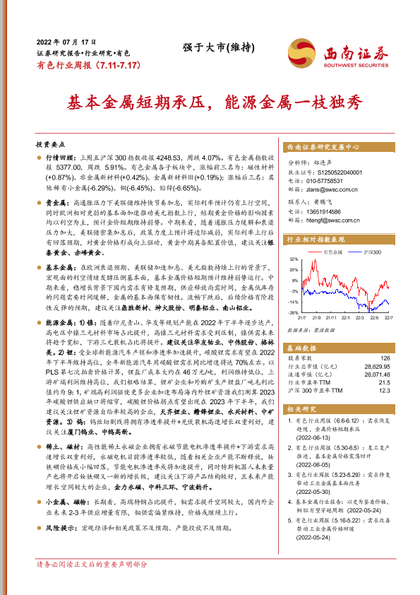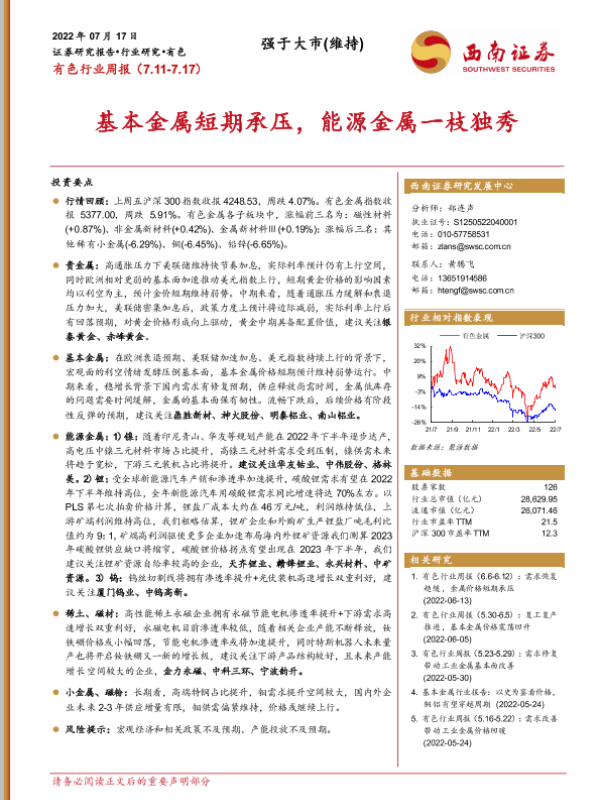 【西南证券】【20220717】20220717-西南证券-有色行业周报:基本金属短期承压,能源金属一枝独秀-16页