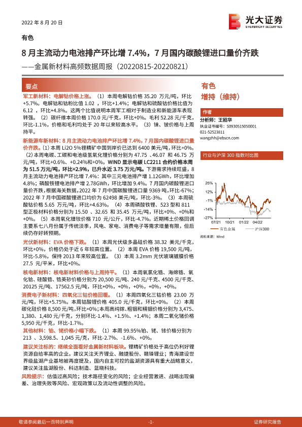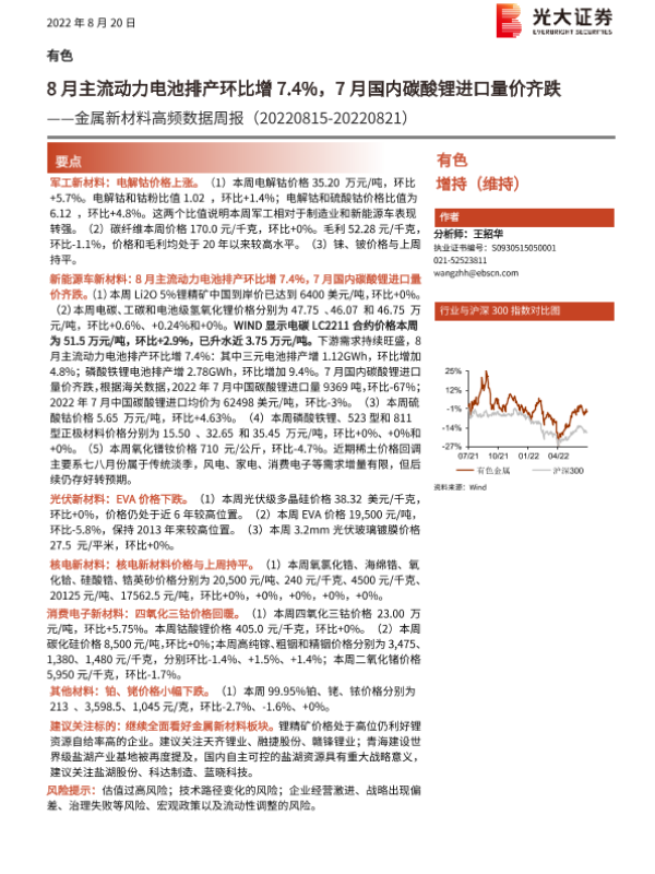 【光大证券】【20220820】20220820-光大证券-金属新材料高频数据周报:8月主流动力电池排产环比增7.4%,7月国内碳酸锂进口量价齐跌-26页