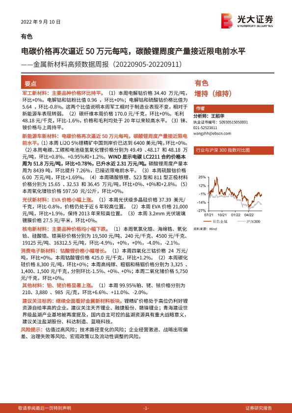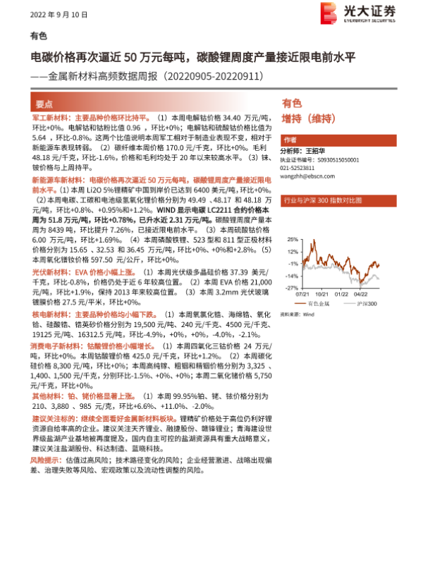 【光大证券】【20220910】20220910-光大证券-金属新材料高频数据周报:电碳价格再次逼近50万元每吨,碳酸锂周度产量接近限电前水平-25页