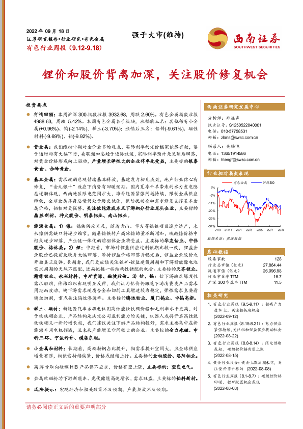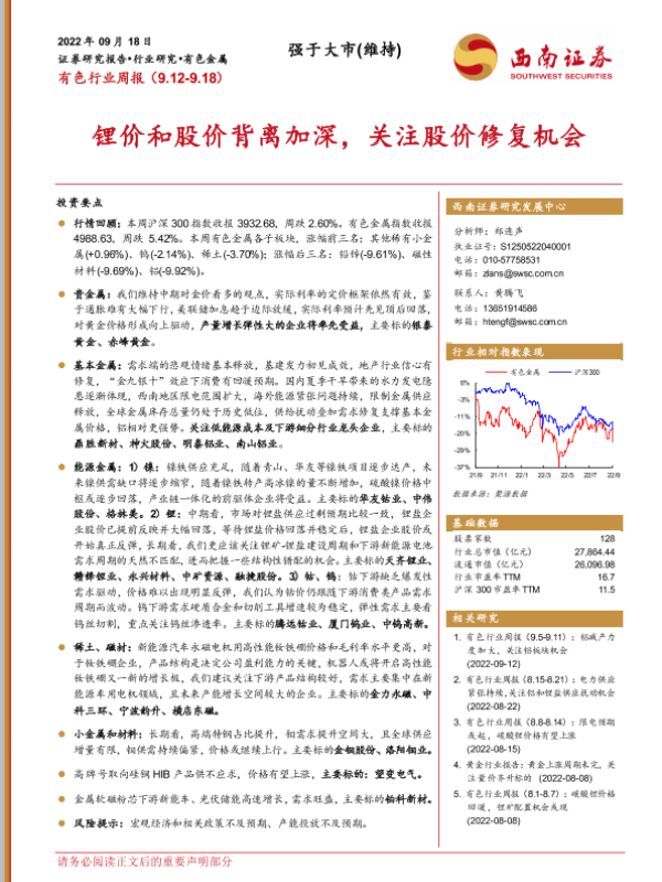 【西南证券】【20220918】20220918-西南证券-有色行业周报:锂价和股价背离加深,关注股价修复机会-17页