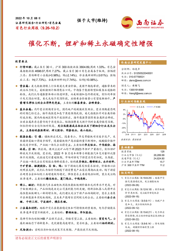 【西南证券】【20221008】20221008-西南证券-有色行业周报:催化不断,锂矿和稀土永磁确定性增强-20页