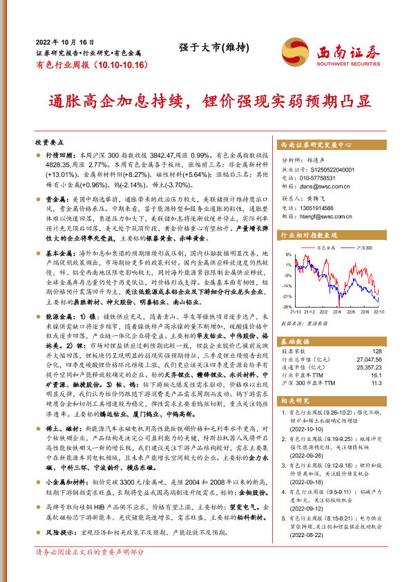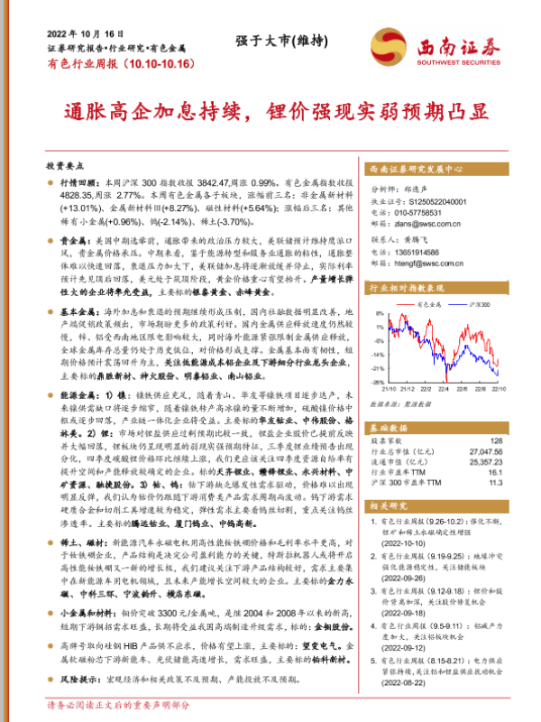 【西南证券】【20221016】20221016-西南证券-有色行业周报:通胀高企加息持续,锂价强现实弱预期凸显-21页