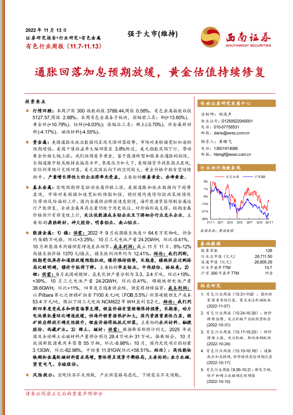 【西南证券】【20221113】20221113-西南证券-有色行业周报:通胀回落加息预期放缓,黄金估值持续修复-24页
