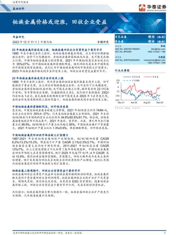 【华泰证券】【20221211】基础材料专题研究:铂族金属价格或迎涨,回收企业受益-18页