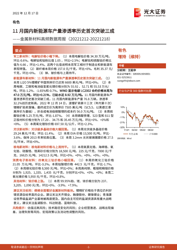 【光大证券】【20221217】20221217-光大证券-金属新材料高频数据周报:11月国内新能源车产量渗透率历史首次突破三成-26页