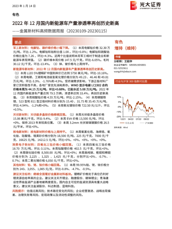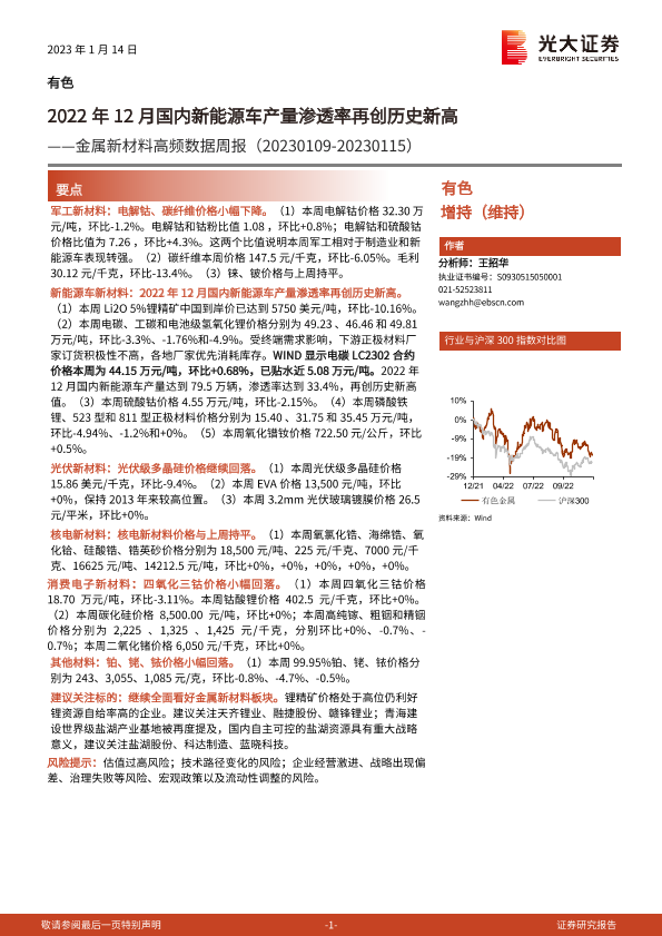 【光大证券】【20230114】20230114-光大证券-金属新材料高频数据周报:2022年12月国内新能源车产量渗透率再创历史新高-25页