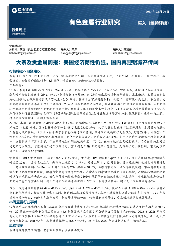 【国金证券】【20230204】20230204-国金证券-大宗及贵金属周报:美国经济韧性仍强,国内再迎铝减产传闻-13页