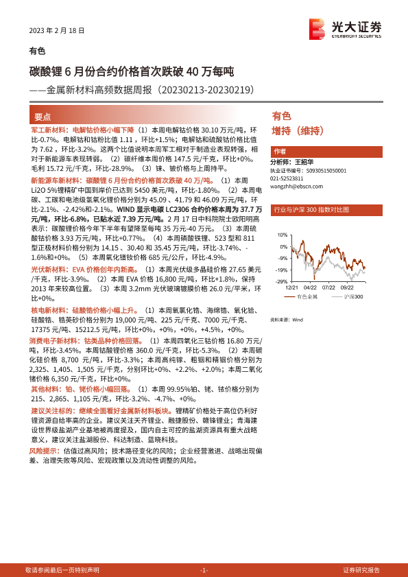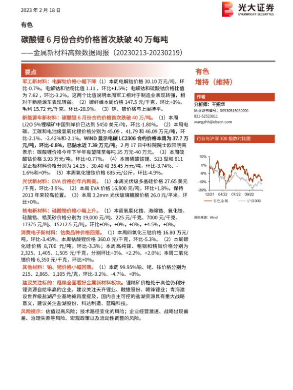 【光大证券】【20230218】20230218-光大证券-金属新材料高频数据周报:碳酸锂6月份合约价格首次跌破40万每吨-25页