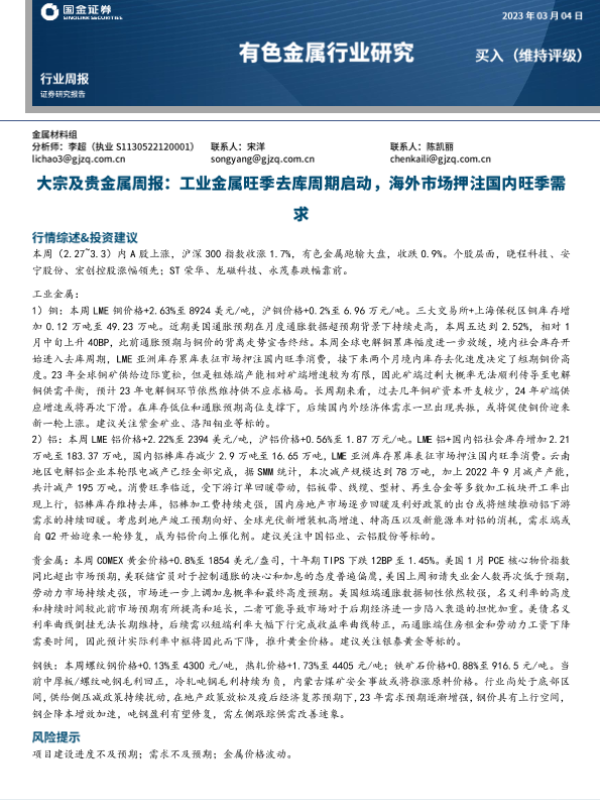 【国金证券】【20230304】20230304-国金证券-大宗及贵金属周报:工业金属旺季去库周期启动,海外市场押注国内旺季需求-13页