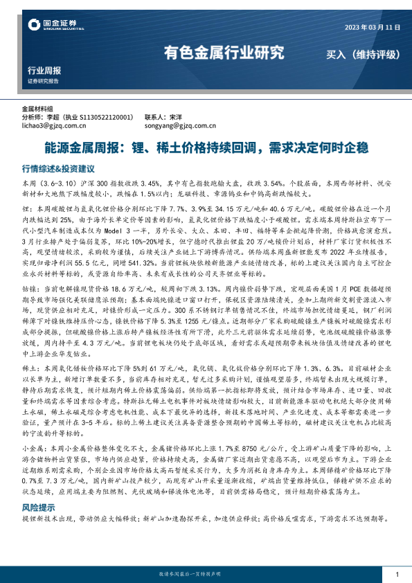 【国金证券】【20230311】20230311-国金证券-能源金属周报:锂、稀土价格持续回调,需求决足何时企稳-16页