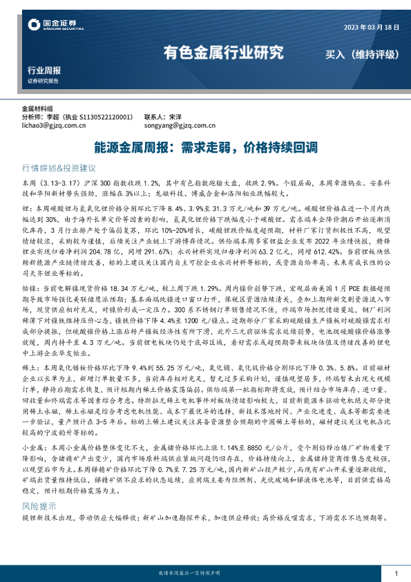 【国金证券】【20230318】20230318-国金证券-能源金属周报:需求走弱,价格持续回调-16页