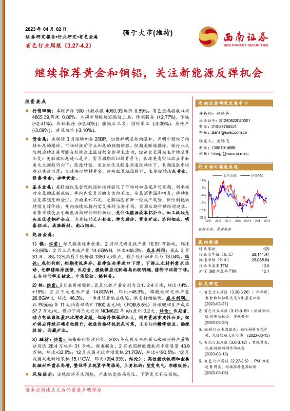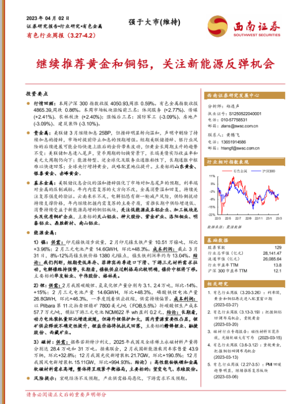 【西南证券】【20230402】20230402-西南证券-有色行业周报:继续推荐黄金和铜铝,关注新能源反弹机会-25页