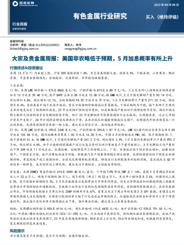 【国金证券】【20230408】20230408-国金证券-大宗及贵金属周报:美国非农略低于预期,5月加息概率有所上升-13页