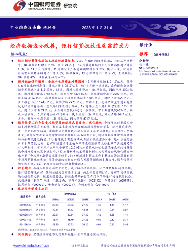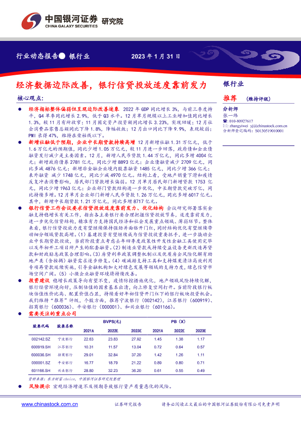 【银河证券】【20230131】zhongg银行业动态报告:经济数据边际改善,银行信贷投放适度靠前发力-18页