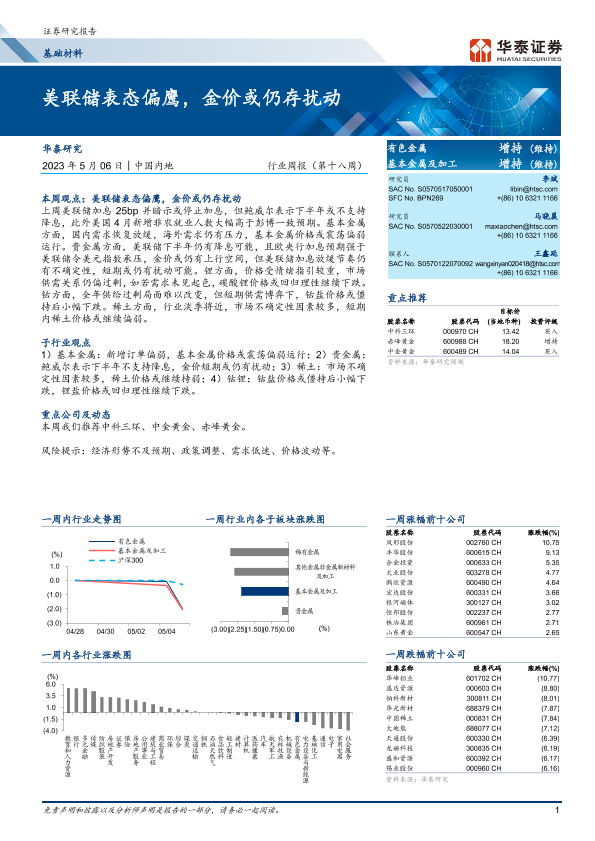 【华泰证券】【20230506】20230506-华泰证券-有色金属行业周报(第十八周):美联储表态偏鹰,金价或仍存扰动-18页