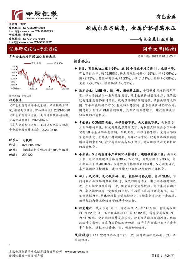 【中原证券】【20230703】20230703-中原证券-有色金属行业月报:鲍威尔表态偏鹰,金属价格普遍承压-24页