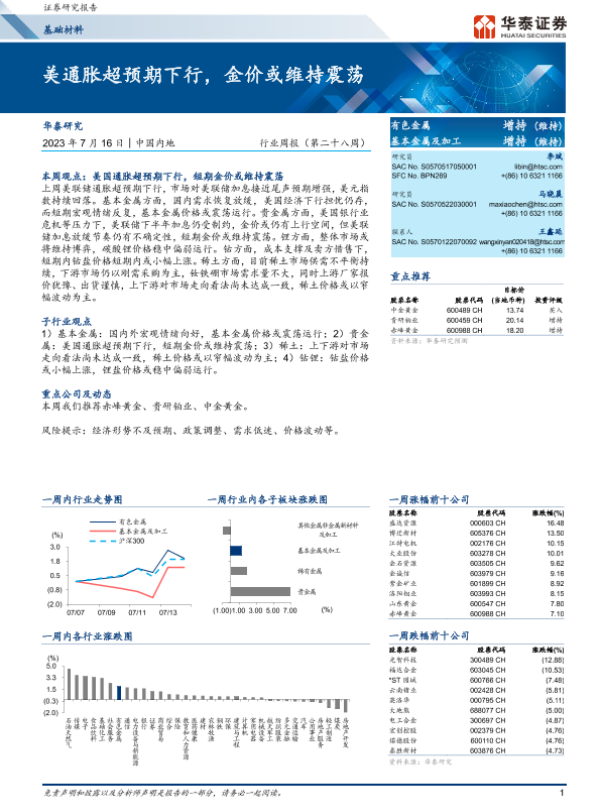 【华泰证券】【20230716】20230716-华泰证券-基础材料行业周报(第二十八周):美通胀超预期下行,金价或维持震荡-16页