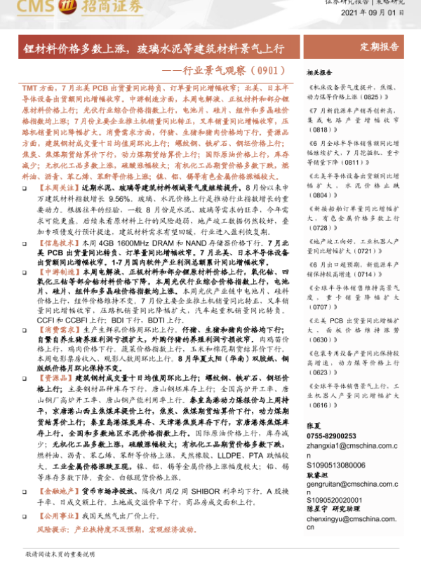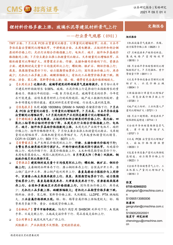 【海通证券】【20210901】行业景气观察:锂材料价格多数上涨,玻璃水泥等建筑材料景气上行-29页