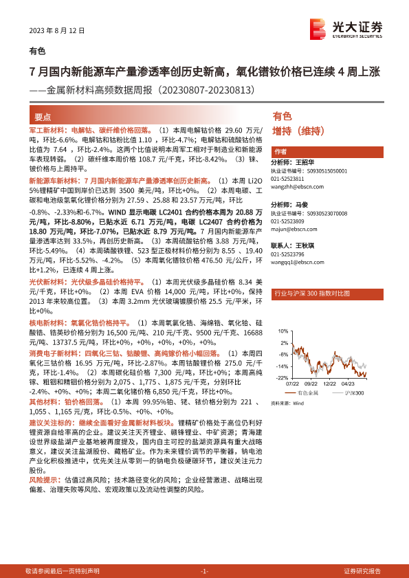 【光大证券】【20230812】20230812-光大证券-金属新材料高频数据周报:7月国内新能源车产量渗透率创历史新高,氧化镨钕价格已连续4周上涨-22页