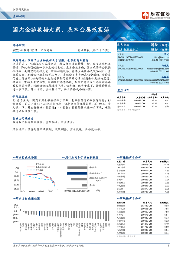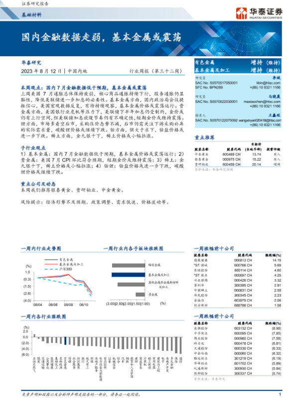 【华泰证券】【20230812】20230812-华泰证券-基础材料行业周报(第三十二周):国内金融数据走弱,基本金属或震荡-16页