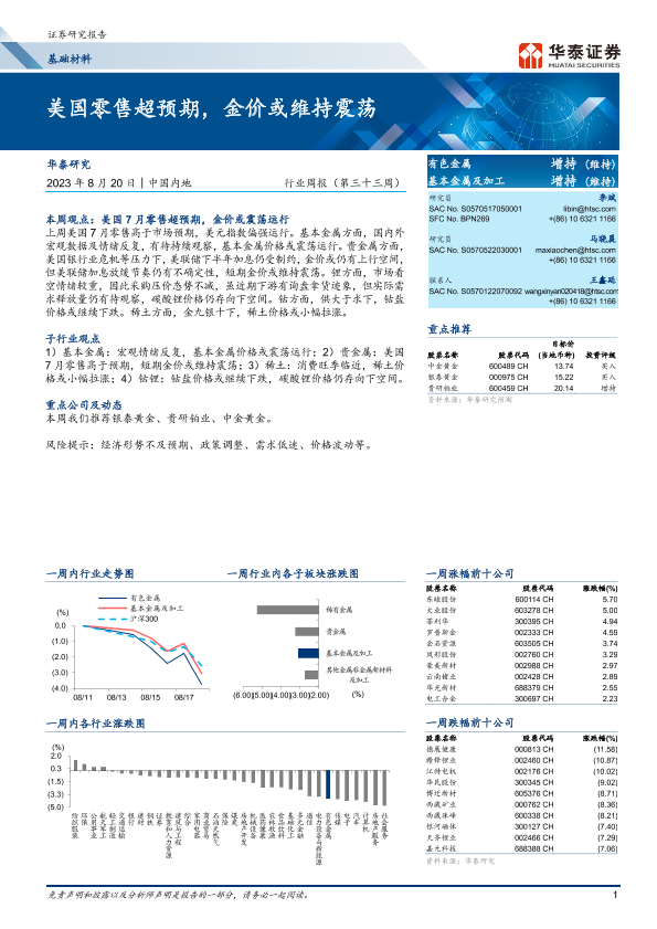 【华泰证券】【20230820】20230820-华泰证券-基础材料行业周报(第三十三周):美国零售超预期,金价或维持震荡-17页