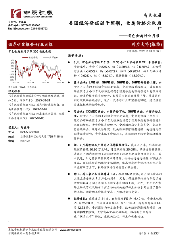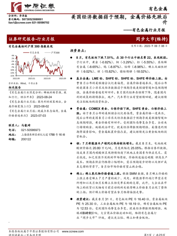 【中原证券】【20230906】20230906-中原证券-有色金属行业月报:美国经济数据弱于预期,金属价格先跌后升-23页