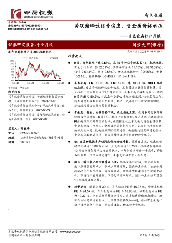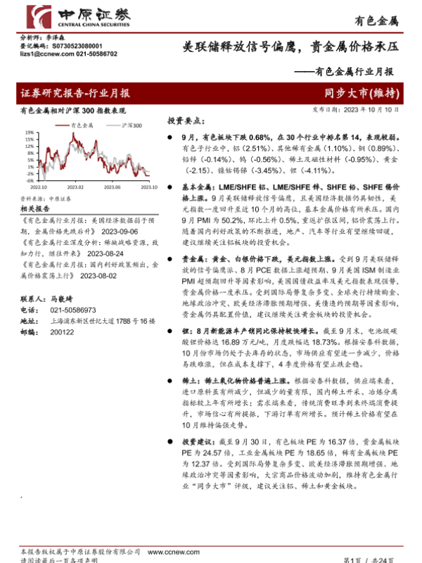 【中原证券】【20231010】美联储释放信号偏鹰,贵金属价格承压-24页