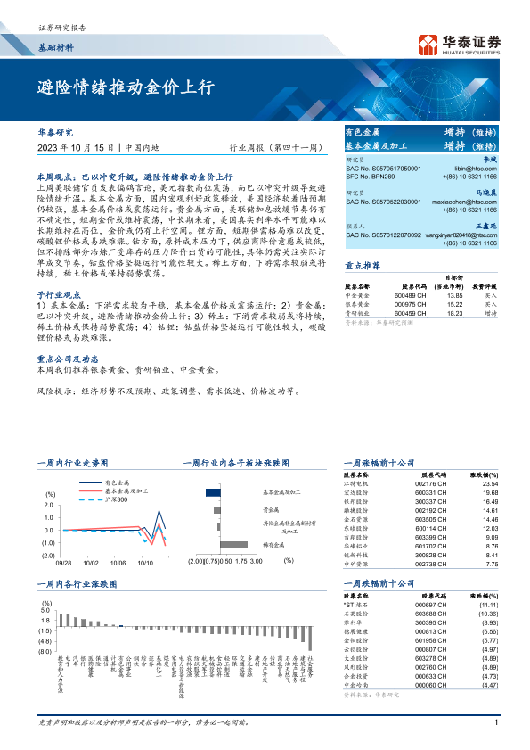 【华泰证券】【20231015】20231015-华泰证券-基础材料行业周报(第四十一周):避险情绪推动金价上行-16页