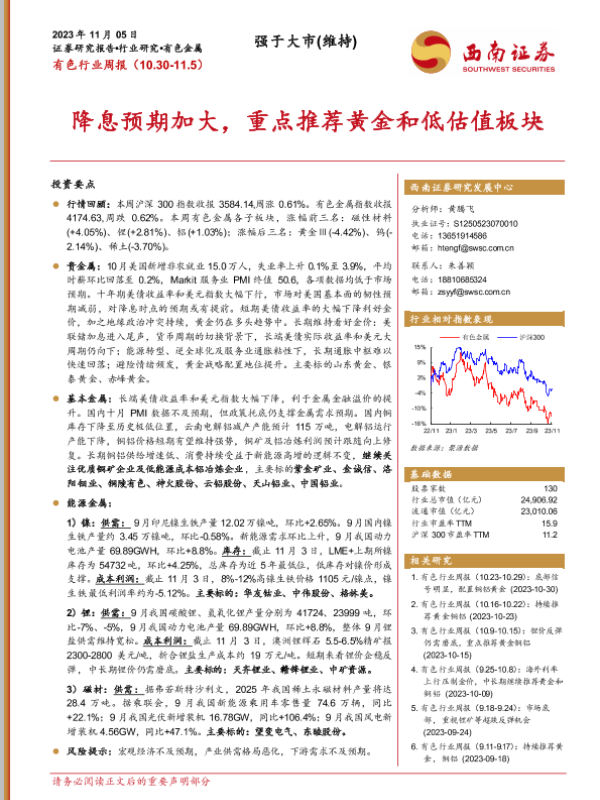 【西南证券】【20231105】20231105-西南证券-有色行业周报:降息预期加大,重点推荐黄金和低估值板块-23页