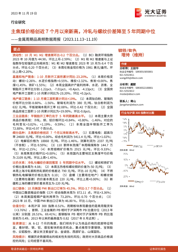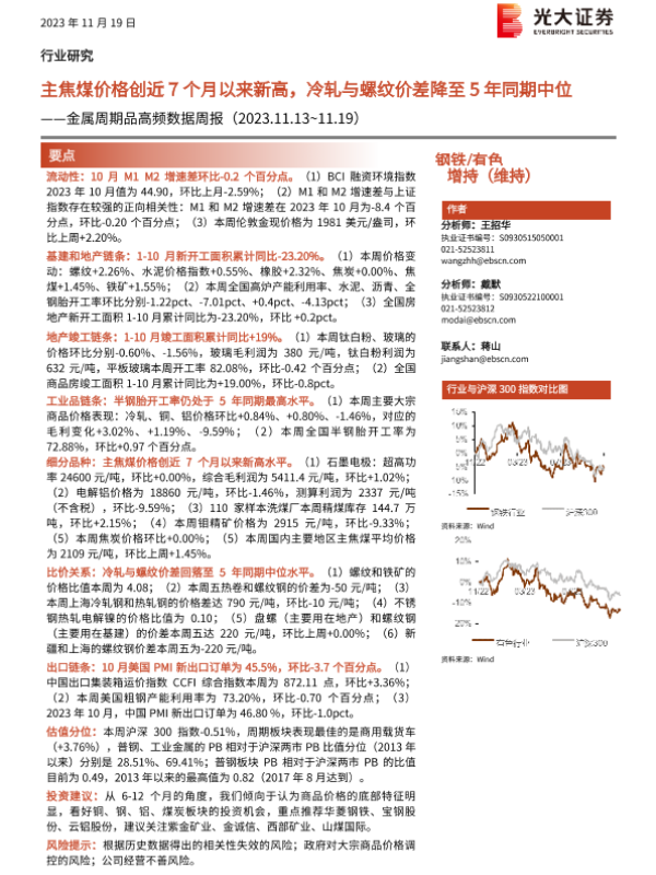 【光大证券】【20231119】钢铁 有色金属周期品高频数据周报:主焦煤价格创近7个月以来新高,冷轧与螺纹价差降至5年同期中位-26页