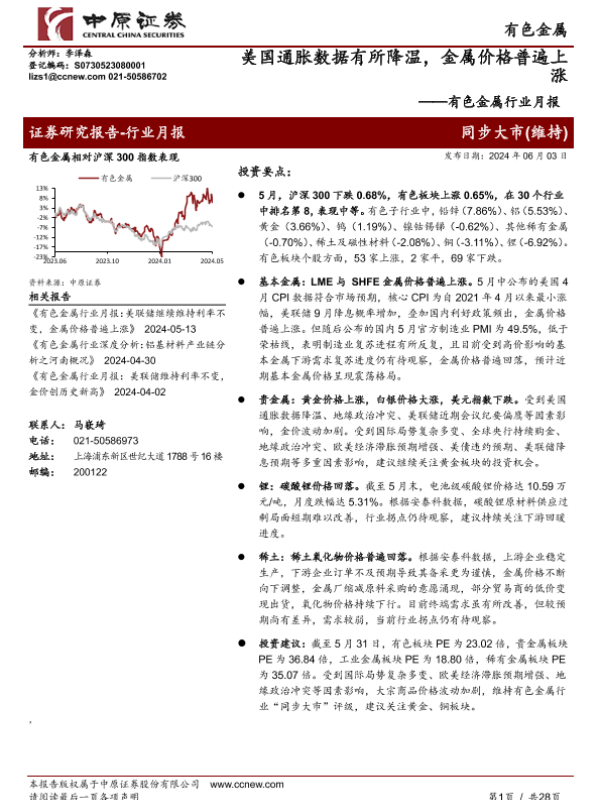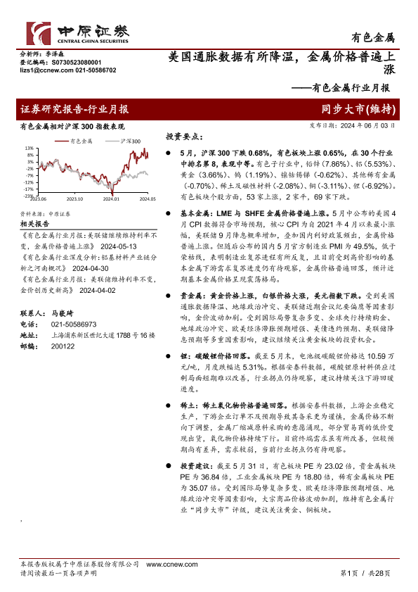 【中原证券】【20240603】20240603-中原证券-有色金属行业月报:美国通胀数据有所降温,金属价格普遍上涨-28页