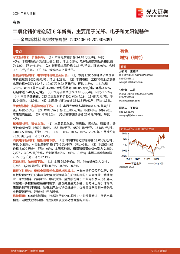 【光大证券】【20240608】20240608-光大证券-有色金属行业金属新材料高频数据周报:二氧化锗价格创近6年新高,主要用于光纤、电子和太阳能器件-22页