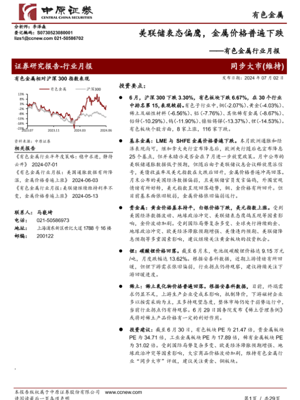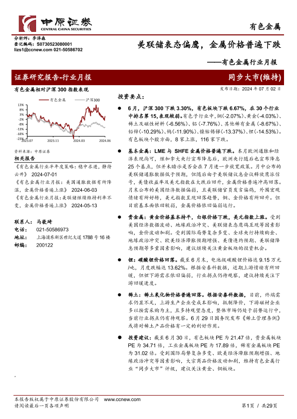 【中原证券】【20240702】20240702-中原证券-有色金属行业月报:美联储表态偏鹰,金属价格普遍下跌-29页